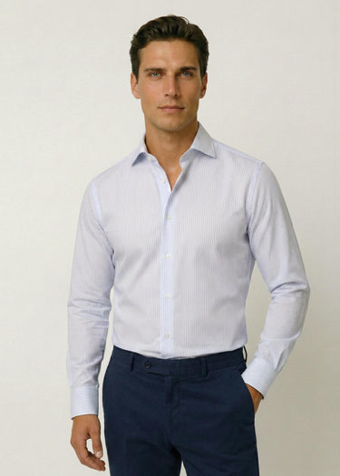 Experience sublime quality in the delicious Twill textile from Italian Albini. The twill shirt is made with a nice cut-away collar with the right hold and rounded cuffs. The fine bias woven textile with light blue stripes gives the shirt a nice and elegant look.